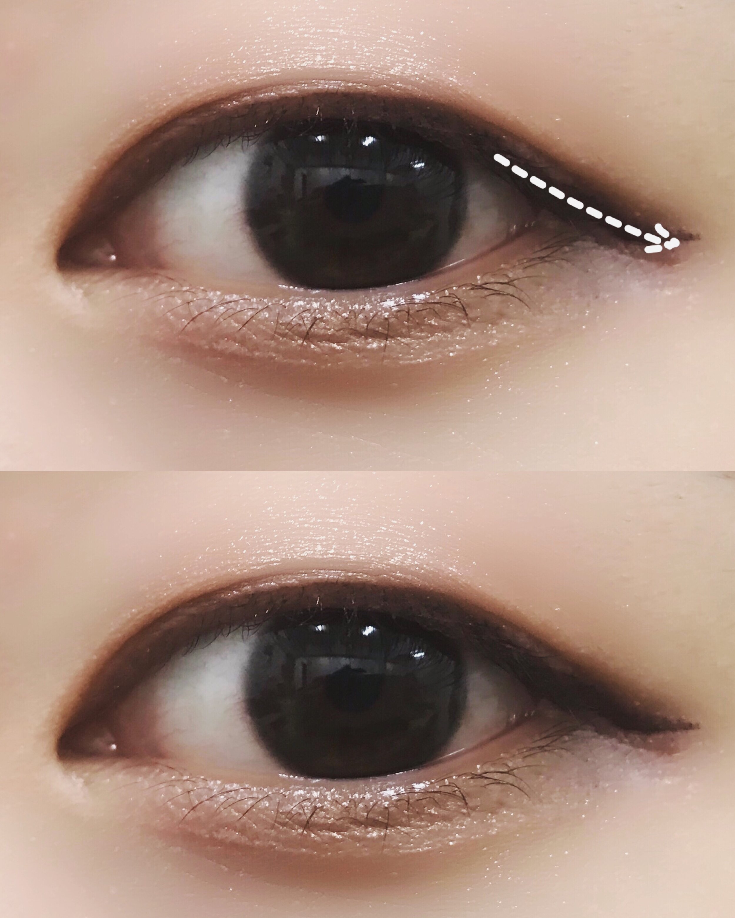 Để vẽ đường kẻ mắt tự nhiên thì bạn có thể sử dụng bút kẻ mắt dạng lỏng hoặc bút kẻ truyền thống màu cà phê, từ vị trí gần đuôi mắt kéo một đường cong hướng xuống tự nhiên theo góc độ cong của con mắt với chiều dài khoảng 0,5-1 cm là được. Nếu như bạn không rành vẽ đuôi mắt thì cũng đừng quá lo lắng quá, chỉ việc kéo đường cong hướng xuống, ở vị trí đuôi mắt ấn nhẹ rồi từ từ nhấc bút lên, bạn có thể tham khảo hình bên dưới nhé~