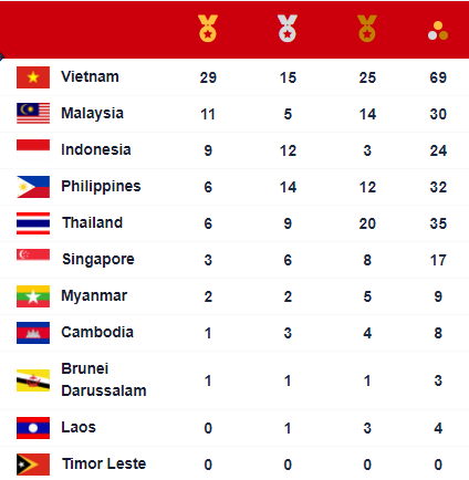 Tính đến thời điểm hiện tại, trên bảng tổng sắp huy chương, Việt Nam đã bỏ xa Malaysia đến 18 tấm huy chương vàng.