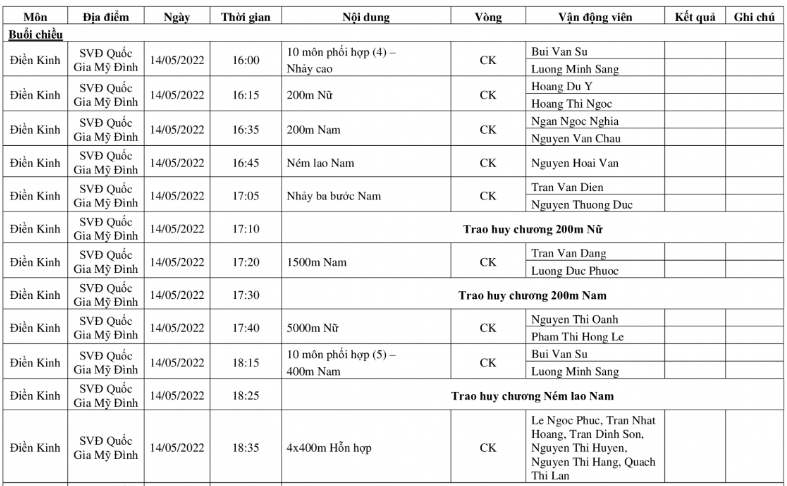 Lịch thi đấu nội dung điền kinh chiều ngày 14/5/2022: