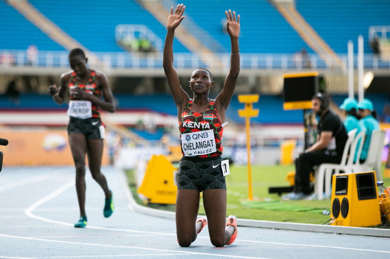 Chelangat xúc động quỳ xuống giơ hai tay lên để chúc mừng chiến thắng. (Ảnh: WA)