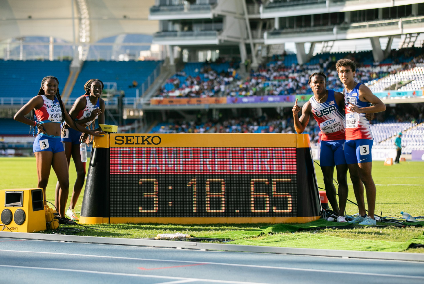 Tuyển Mỹ đã xuất sắc phá kỷ lục đại hội ở vòng loại với thông số 3 phút 18 giây 65 và sau đó là thành tích 3 phút 17 giây 69 ở vòng chung kết. Các thành viên của tuyển Mỹ gồm Charlie Bartholomew, Madison Whyte, Will Summer và Kaylyn Brown. Theo sát phía sau là tuyển Ấn Độ với 2 lần phá kỷ lục châu Á với 3 phút 19 giây 62 ở vòng loại và 3 phút 17 giây 76 ở vòng chung kết. Hạng 3 là tuyển Jamaica với thành tích 3 phút 19 giây 98. Ngoài ra, một số quốc gia tạo thành tích tốt nhất ở mùa giải là Ba Lan (3 phút 22 giây 52), Cộng Hòa Séc (3 phút 29 giây 18).