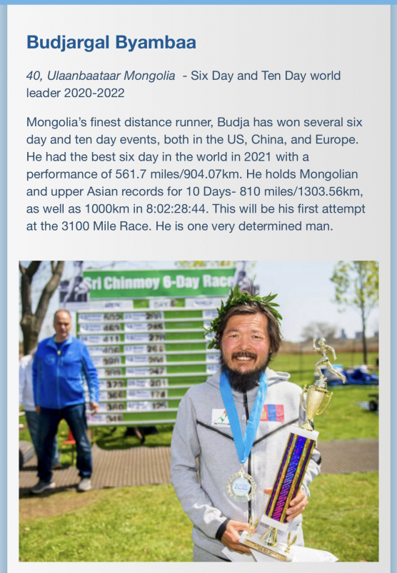 Đối thủ tiếp theo đó là Vasu Duzhiy của Nga, người từng tham dự 9 lần, trong đó 3 lần giành chiến thắng. Ngoài ra, còn có kỷ lục gia Mông Cổ Budjargal Byambaa, runner hiện đang nắm giữ kỷ lục thế giới nội dung chạy 6 ngày với thành tích 904,07km và kỷ lục châu Á 1.303,56km cho nội dung chạy 10 ngày, anh này chỉ mới 40 tuổi; mặc dù đây là giải 3.100 dặm đầu tiên của bản thân, song Byambaa hứa hẹn nhất định nỗ lực hết sức để đăng quang tại giải chạy năm nay.