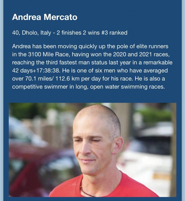Một cao nhân khác đó là chân chạy người Ý Andrea Mercato, người hai lần liên tục giành chiến thắng năm 2020 và 2021. Mercato năm ngoái chỉ mất 42 ngày đã hoàn thành cự ly chạy.