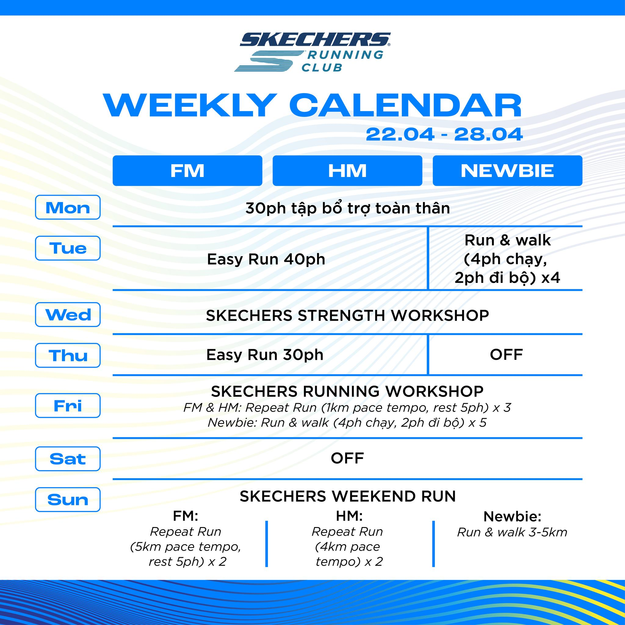 •Chủ nhật (LongRun - cải thiện Endurance): Từ 5h30 đến 8h30; Route: tùy từng event; Cự li: từ 21.1km trở lên.