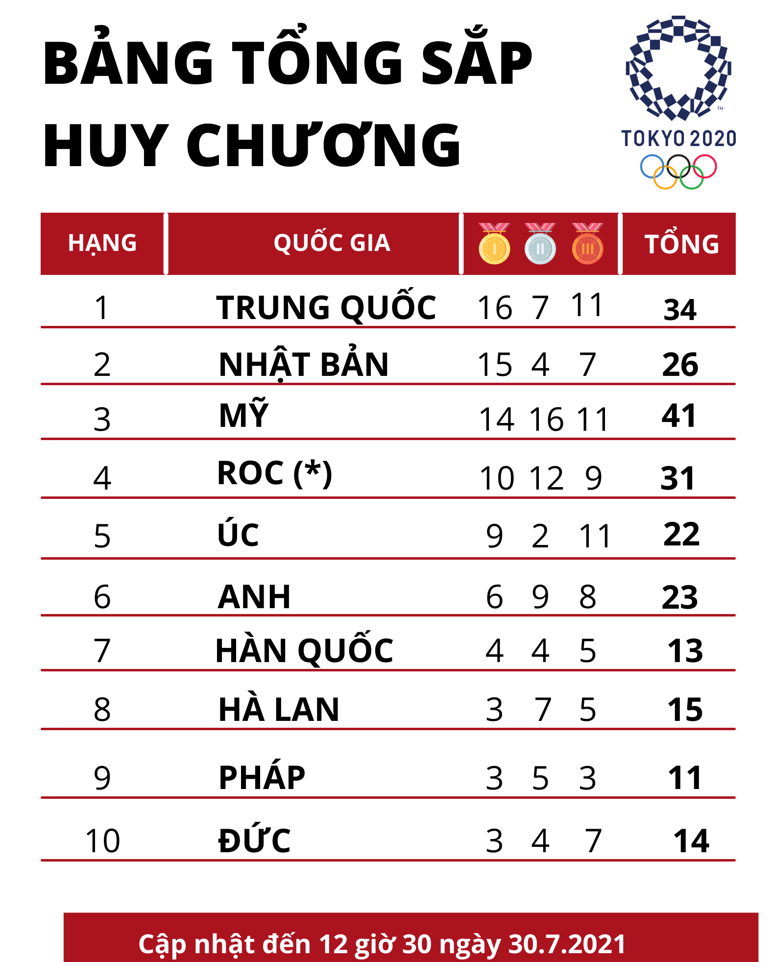 (*) ROC là viết tắt từ Russian Olympic Committee (Ủy ban Olympic Liên bang Nga). Liên bang Nga đứng thứ 4 tại Olympic Rio 2016 (Brazil) sau khi giành được 56 huy chương. Nhưng tại Olympic Tokyo 2021, quốc gia này không thể sử dụng tên, quốc kỳ hoặc quốc ca của họ. Thay vào đó, Liên bang Nga sẽ thi đấu dưới cái tên ROC. Nguyên nhân là do Nga đã bị Tòa án Trọng tài Thể thao (CAS) xử phạt sau cáo buộc điều hành một chương trình doping do nhà nước hậu thuẫn.