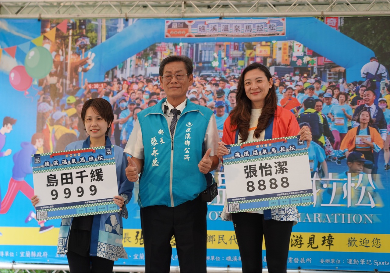 Vận động viên chạy đường dài nổi tiếng người Nhật Bản Shimada Chikayu (trái), Trưởng hương Jiaoxi Trương Vĩnh Đức (giữa) và cựu tuyển thủ bóng chuyền Trương Di Kiệt (phải) cùng chào đón Giải Marathon Suối Nước Nóng Jiaoxi 2024 (Hình ảnh: Văn phòng Hương Jiaoxi).